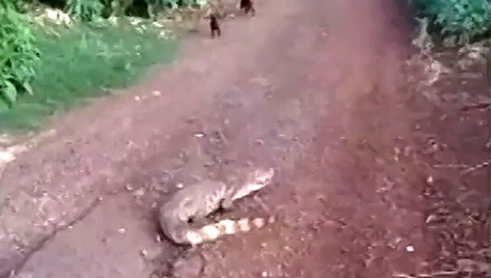 Um visitante inesperado deu um susto em uma família de Toledo, no Oeste do Paraná, na manhã de terça-feira (7). Acordados pelos latidos da cachorrada, moradores de uma propriedade rural na cidade foram verificar o que estava acontecendo e encontraram um jacaré de papo amarelo no meio da estrada.