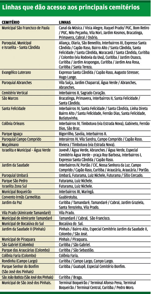 “Através do histórico que temos de demanda, constatamos que existe aumento no número de passageiros nessas linhas, que passam próximo aos 31 cemitérios”, explica Ismael França, coordenador da área de transporte coletivo da Urbanização de Curitiba (Urbs).