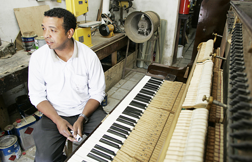 Se você é daqueles que não pode ver um piano e já pensa em dedilhar as teclas do instrumento, irá se sentir em casa na oficina de Robson Luiz Barbosa, 36. O empresário, que trabalha com o instrumento há 20 anos e está há oito na Vila Maria, no Novo Mundo, garante que não se incomoda com a mania da maioria das pessoas que passam por lá. “É bom usar, o piano não pode ficar parado”, diz.