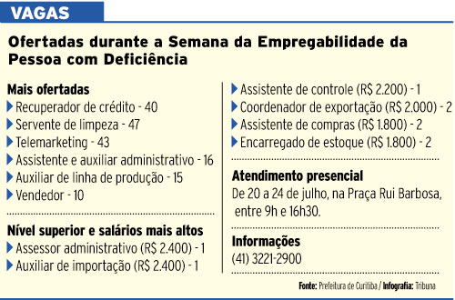 Começa hoje a Semana da Empregabilidade da Pessoa com Deficiência, promovida pela prefeitura de Curitiba. O evento reúne mais de 240 vagas de trabalho exclusivamente pra pessoas com deficiência, com salários que variam de R$ 1 mil a R$ 2,4 mil, pra níveis fundamental, médio e superior.