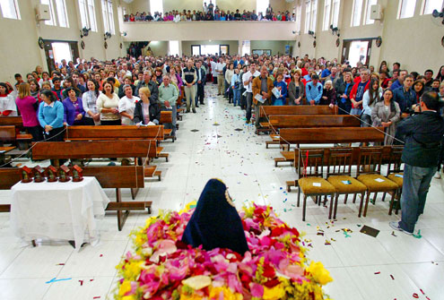 Uma demonstração da enorme devoção que Nossa Senhora Aparecida recebe em todos os cantos do País. “Viva Nossa Senhora Aparecida! Viva!”, celebravam os devotos de Campo Largo. A missa foi comandada por dom Moacyr Vitti, arcebispo Metropolitano de Curitiba. Apesar da forte chuva, a igreja ficou pequena. Muita gente ficou para fora.