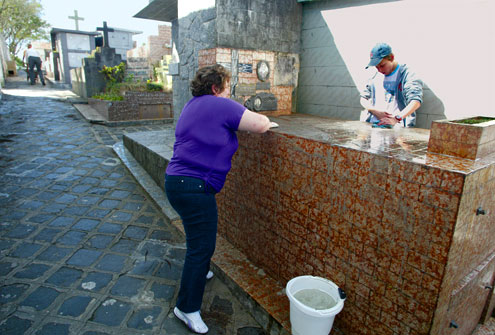 A família Fabre Taborda não poupou esforços, ontem, no Cemitério Municipal São Francisco de Paula. Mãe, filha e neto carregaram baldes de água e esfregaram cada parte do local.