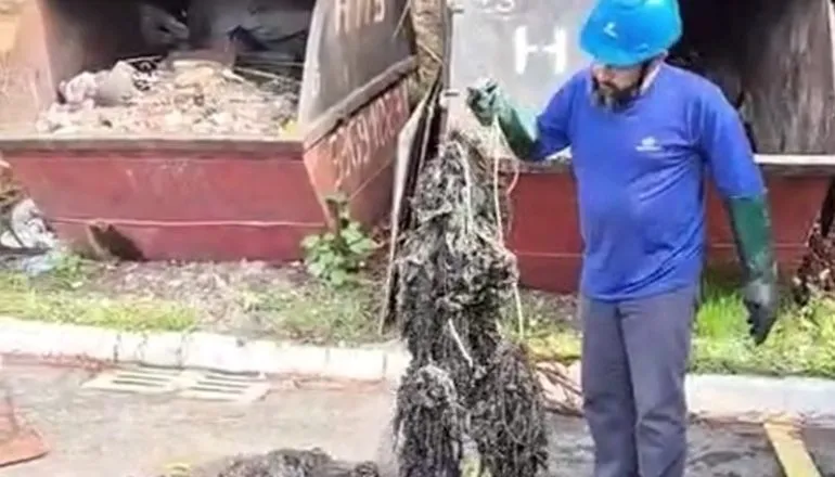 Na quarta-feira (28/01), o agente técnico operacional da Sanepar Adriano Faria foi o responsável pela limpeza do local. Segurando um emaranhando de sujeira desagradável, ele descreve o que encontrou.