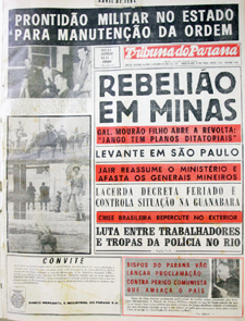 A seguir vários títulos secundários, todos com destaque para o assunto palpitante: “Prontidão militar no Estado para manutenção da ordem”, “General Mourão abre a revolta”, “Levante em São Paulo”, “Lacerda decreta feriado e controla situação na Guanabara”.