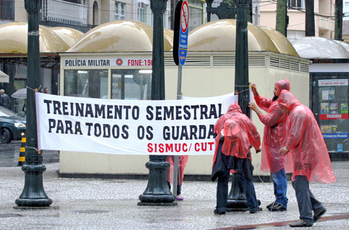 A falta de segurança até para quem deveria promovê-la foi um dos motivos que levaram cerca de 20 guardas municipais de Curitiba a realizar um ato de protesto ontem, na Boca Maldita, no centro da capital. Os servidores protestaram contra as últimas três mortes de guardas municipais registradas nos últimos quatro meses. Durante o ato, promovido pelo Sindicato dos Servidores Públicos Municipais de Curitiba (Sismuc), ainda foram distribuídas cópias de uma carta aberta à população, onde, além de ressaltar a exposição da categoria à criminalidade, reivindicam uma revisão das condições de trabalho e de uma política de qualificação e capacitação dos guardas.