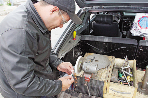 Ontem, a Tribuna encontrou Agnaldo trabalhando nas ruas do Bairro Novo. Com uma pequena caixa de som instalada no teto do carro, ele dirige lentamente, aguardando os clientes saírem para buscar salvação às suas velhas panelas. Sua pequena oficina é transportada no porta-malas. Com uma bateria de carro, ele usa um afiador elétrico e uma parafusadeira. Quatro gavetas perfeitamente projetadas para o espaço completam a oficina.