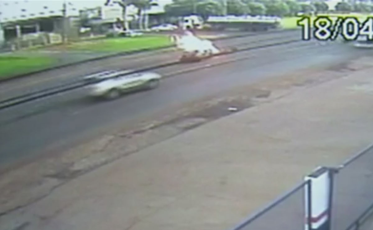 Um acidente impressionante envolvendo um motociclista foi flagrado por câmeras de segurança no Contorno Sul de Maringá, na região noroeste do Paraná, na manhã desta terça-feira (18).
