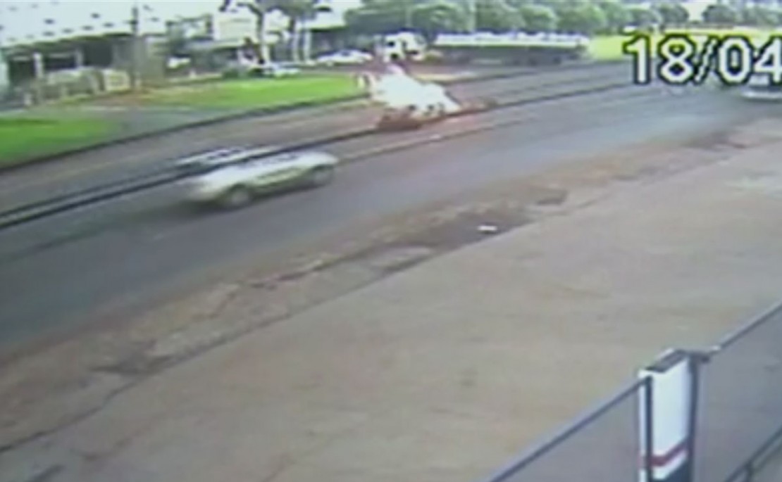 Nas imagens dá para perceber que o motociclista já caiu em chamas no asfalto logo após ser atingido pelo carro, que invadiu a faixa oposta. Instantes depois várias pessoas aparecem e apagam as chamas.