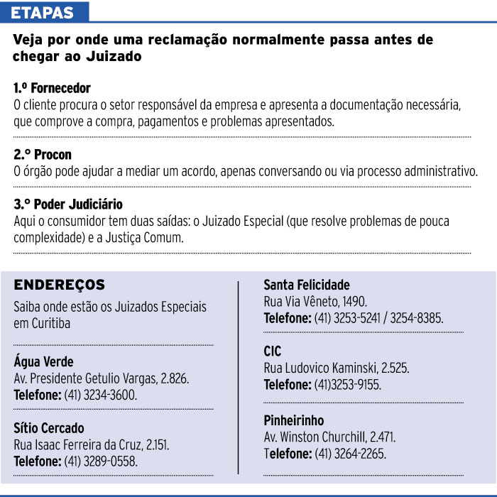 Ao se deparar com uma situação não resolvida pelo fornecedor ou vendedor, os clientes podem tanto procurar a Justiça Comum como o Juizado Especial. Porém, segundo o professor de Direito Civil Rodrigo Xavier Leonardo, da Universidade Federal do Paraná (UFPR), a Justiça Comum pode ser mais demorada e é mais indicada para casos complexos. “No Juizado Especial o processo é gratuito, não há custas processuais. Na Justiça Comum, há custos”, esclarece. A isenção refere-se a custos de movimentação dos processos, mas despesas como documentos e fotocópias, ficam a cargo do cidadão.