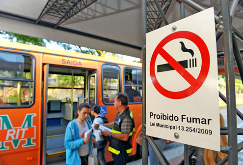 “O trabalho vai continuar e queremos que cada cidadão nos ajude para que todos cumpram seu papel”, disse. Depois da fiscalização no sábado e no domingo, a semana começou com orientação nos terminais de ônibus da cidade, locais em que também é proibido fumar, inclusive nos que não são cobertos e ficam mais distantes do setor de embarque. Quem desrespeitar a norma e insistir na prática será convidado a se retirar do local, de acordo com a prefeitura. “Algumas pessoas acham que, por estarem fora da área coberta, podem fumar. Só que não é assim: o terminal é uma área onde uma quantidade enorme de pessoas circula ao mesmo tempo e, por isso, toda ela precisa ficar resguardada”, explicou Paz. A ação seguirá nos próximos dias pelos demais terminais da cidade.