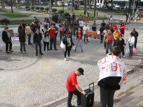 Cerca de 100 manifestantes ligados ao Movimento Popular por Moradia (MPM) e à Frente Nacional de Resistência Urbana se reuniram na manhã desta sexta-feira (14) na Praça Santos Andrade para realizar o ‘Ato Nacional contra os Crimes da Copa de 2014’. Além de Curitiba, a manifestação também aconteceu em Brasília, onde um grupo de 400 pessoas queimou pneus para fechar a principal via de acesso ao Estádio Mané Garrincha.