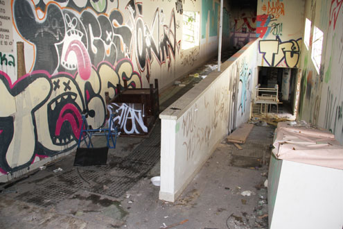 Com os portões arrombados, andarilhos da região invadiram o prédio. A fachada está completamente destruída, com muros e paredes pichadas. Na área interna, o local serve de moradia para mendigos e mocó para usuários de drogas. Nos corredores, há muito entulho e móveis destruídos e um dos leitos foi até incendiado pelos vândalos.