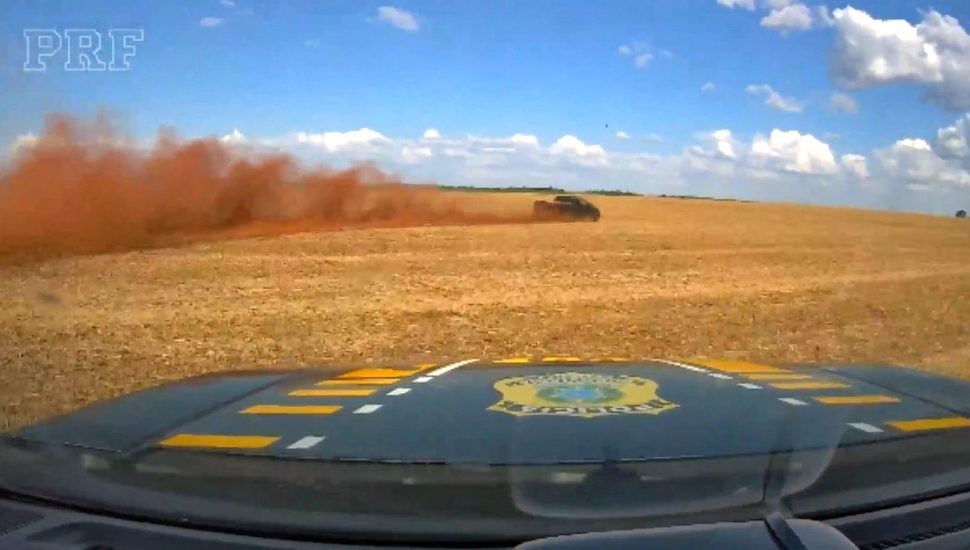 Após se dar conta de que não conseguiria se desvencilhar dos policiais rodoviários federais, o contrabandista atravessou uma área de plantação recém-colhida, onde fez outras manobras em zigue-zague, em mais uma tentativa de provocar danos à viatura da PRF e escapar do acompanhamento.