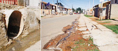 Na Rua Tangerineira, os moradores enfrentam o mesmo problema. O esgoto sai por um cano diretamente para a rua, escorrendo próximo ao meio-fio. Wagner Freire de Medeiros, que mora ali, reforça que o esgoto deixa um cheiro forte. “E ainda tem a boca de lobo entupida. Fica aí desse jeito”, afirma. A parte da frente de muitos terrenos tem terra e brita, que escorrem para a rua nos dias de chuvas fortes. Alguns moradores já fizeram piso e construíram muros, para delimitar as propriedades, amenizando o problema.