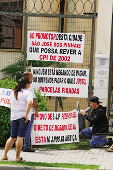 Representantes de 10 mil famílias ameaçadas de despejo em São José dos Pinhais protestaram na manhã de ontem, em frente ao fórum da cidade, para tentar sensibilizar as autoridades sobre ações que sofrem na Justiça. Os moradores, que ocupam mais de 24 loteamentos, exigem negociação justa de seus contratos de compra de terrenos, envolvendo imobiliárias em vários bairros da região. Segundo os mutuários, muitos deles sofrem pressões diárias de processos de reintegração de posse.