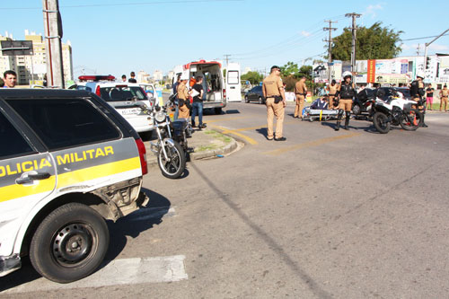 Uma viatura do 20.º Batalhão da Polícia Militar e uma motocicleta bateram no cruzamento da Rua Paulo Kissula e Avenida Victor Ferreira do Amaral, Tarumã, ontem à tarde. A PM estava em comboio com outras duas, todas com as sirenes ligadas, seguindo para o Bairro Alto.