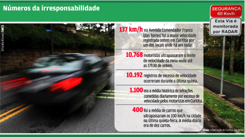 Mais de 30 carros passaram a mais de 100 quilômetros por hora nas primeiras nove horas de ontem dentro da cidade de Curitiba. Na última quinta-feira, quase 400 carros passaram pelos locais com velocidade acima dos 100 quilômetros por hora, enquanto essa média, até então, costumava ser de dez veículos por dia.