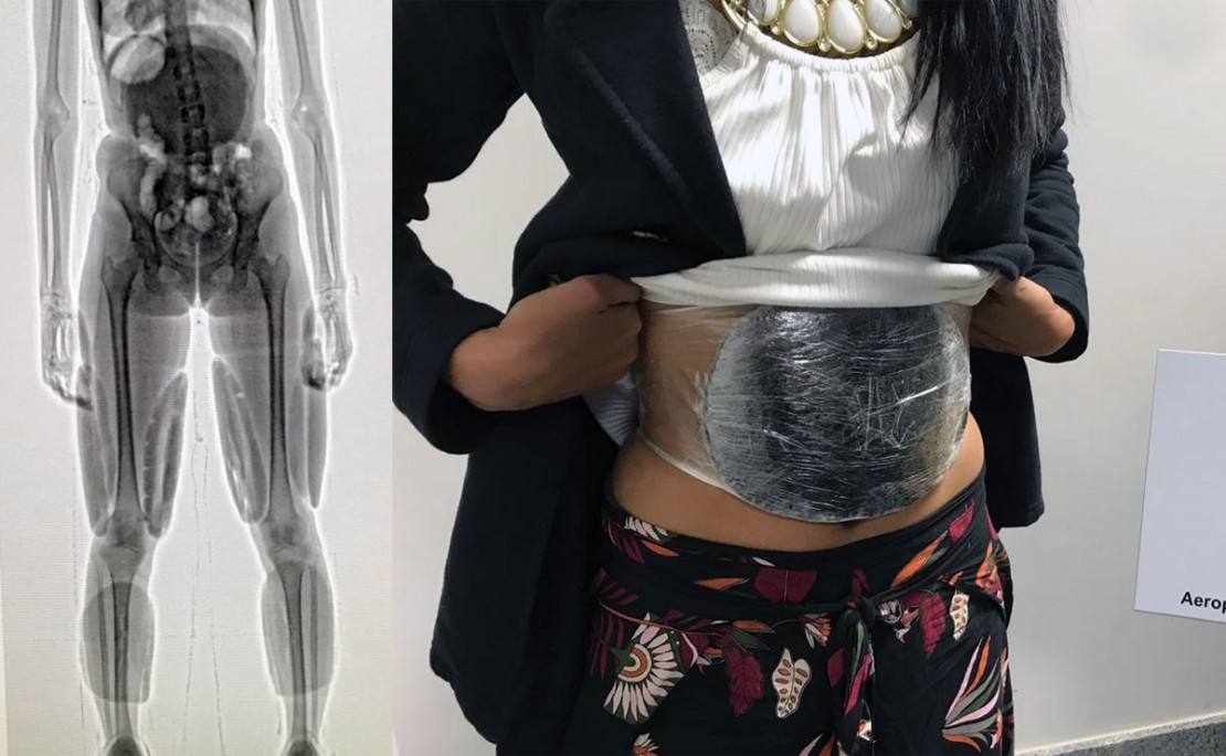 Os agentes perceberam o nervosismo da mulher e a submeteram ao scanner (imagem acima), que apontou a droga presa na barriga, coxa, e panturrilha. A mulher, não identificada, contou aos policiais que chegou de ônibus a Foz do Iguaçu no último dia 22, com o objetivo de levar os entorpecentes para São Paulo. Ela receberia, além da hospedagem e passagem, a quantia de R$ 2 mil.