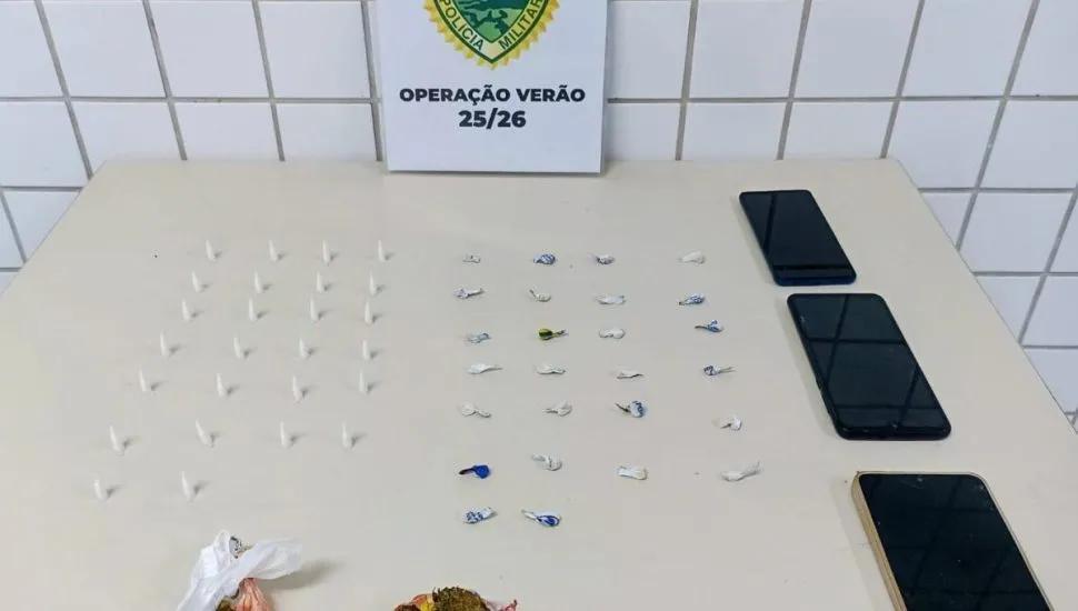 Equipes de patrulhamento com quadriciclos e apoio de viatura realizaram abordagens a indivíduos suspeitos na área central da cidade. Durante as buscas, os policiais encontraram 26 pinos de cocaína, 26 pedras de crack e dois invólucros de maconha, totalizando 37,4 gramas de drogas. Também foram apreendidos R$ 376 em dinheiro e três aparelhos celulares.