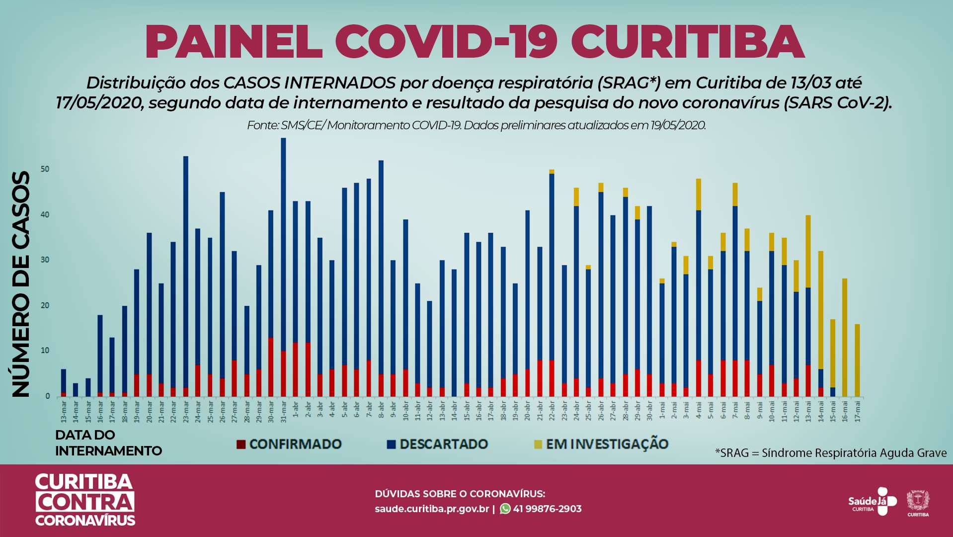 No boletim sobre o a Covid-19 da última sexta-feira (22), a Secretaria Municipal de Saúde de Curitiba apresentou a relação dos casos de SRAG com os de coronavírus na capital. Segundo a infectologista da prefeitura Marion Burger, o sistema de saúde da cidade vem registrando, em média, 30 casos de SRAG por dia em Curitiba. “Todos estes são testados para coronavírus, estamos tendo resultado positivo para uma média de 15% apenas”, diz. O município também informa que investigou, com a realização de testes pós-morte, 240 óbitos e apenas um teve resultado positivo para Covid-19.