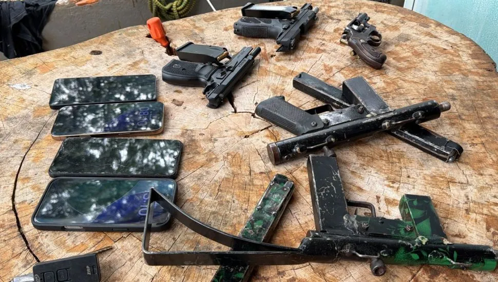 Na chácara, os policiais apreenderam cinco armas de fogo, incluindo metralhadoras artesanais, pistolas e um revólver. Também foram recolhidos diversos aparelhos celulares, que serão analisados, além da recuperação de parte da carga roubada. Dois veículos encontrados na propriedade também foram apreendidos.