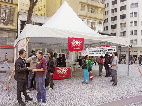 O Sindicato dos Trabalhadores em Educação Pública do Paraná (APP-Sindicato) realizou ontem ato na Boca Maldita, para esclarecer a população sobre a posição da categoria. Além disso, a mobilização com panfletagem também fazia parte do dia de marcha nacional da categoria em Brasília para a reivindicação da aplicação do piso nacional dos professores em todos o País.