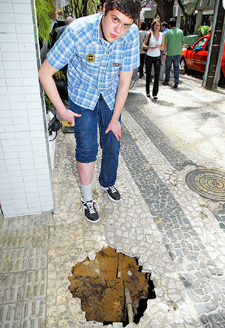 Andar na rua e ser tragado por um buraco na calçada. A cena aconteceu ontem, por volta do meio-dia, com o publicitário Eduardo Lubiazi, de 20 anos. Ele ia almoçar com amigos quando a calçada desabou sob seus pés, na Rua Visconde do Rio Branco, no Centro de Curitiba.