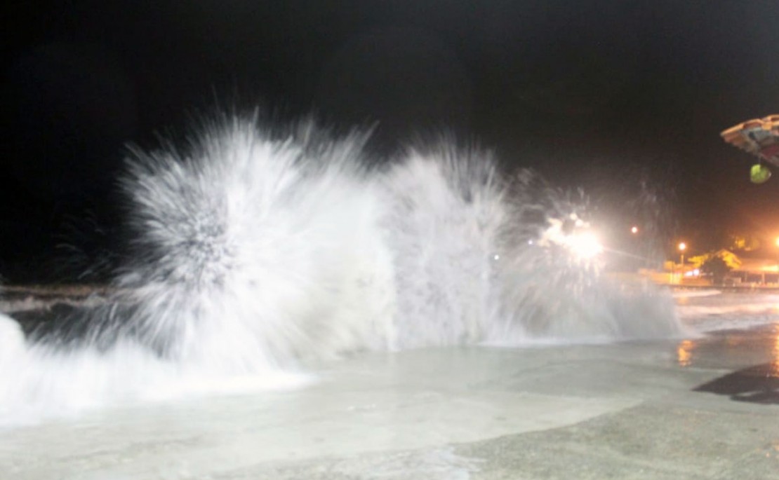 As imagens mostram as ondas batendo em um paredão de pedras e invadindo a área de calçada.