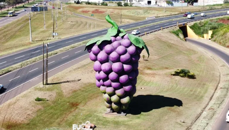 No trevo de acesso a Marialva, região Norte do Paraná, é fácil notar um grande cacho de uva construído em concreto armado e instalado na entrada da cidade O monumento faz homenagem a viticultura, economia em que a cidade se destaca.