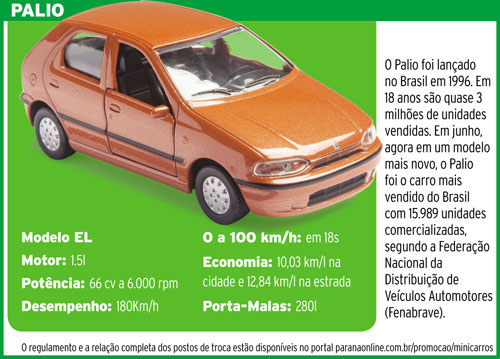 Na próxima segunda-feira começam a ser publicados os selos do Palio, novo modelo da promoção Minicarros Tribuna. Todos os dias, entre 1.º e 6 de setembro, a Tribuna trará um selo numerado na capa. Basta juntar três, cuidando para que não sejam repetidos, colar na cartela e no dia 8 de setembro fazer a troca pela miniatura do Palio.