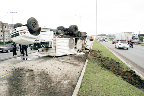 Um caminhão da Sanepar capotou sozinho, na tarde de ontem, na canaleta exclusiva para ônibus e veículos autorizados da Linha Verde, Xaxim. O motorista não se feriu. A Sanepar, informou que, a princípio, o acidente foi provocado por causa da chuva, mas os motivos ainda estão sendo apurados. A pista ficou interditada até a retirada do veículo.