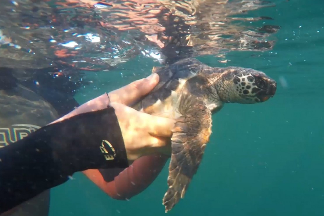 Já a tartaruga, bem pequena, ainda juvenil, foi encontrada enroscada em um saco de estopa na praia de Barra do Saí, em Guaratuba, em 14 de dezembro de 2018. A tartaruguinha estava bastante debilitada, magra e coberto por cracas de sujeira.
