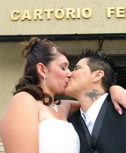 Ao lado das duas- Rafaele e Denise – estavam as testemunhas Cristina Franco Ribeiro (irmã de Rafaele) e Sonia Maria Leopoldino da Silva. E observando a cerimônia, o garoto André, de 5 anos, filho de uma união informal de Rafaele com um rapaz. “O relacionamento não deu certo e eu conheci Denise e a gente se gostou”, confessou emocionada depois. Ao ato de assinatura do documento de união civil conduzido pelo tabelião Luís Flávio Fidelis Gonçalves, seguiu-se uma cerimônia presidida pelo juiz de paz Rogério Alceu Aleixo, que usou todos os floreios de ocasião destinados a casamentos entre pessoas de sexos diferentes. “Haja sempre serenidade e paz em vossos corações e que vocês consigam trilhar juntas o vosso caminho”, disse ele.