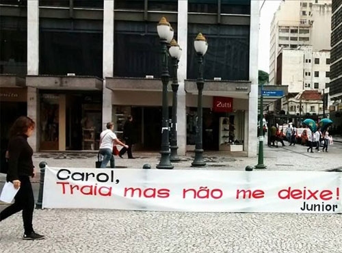 Uma faixa chamou a atenção de quem passou pelo calçadão da Rua XV na manhã desta terça-feira (14). Colocada em frente a um banco próximo da Boca Maldita, a faixa dizia: “Carol, traia mas não me deixe. Junior.”