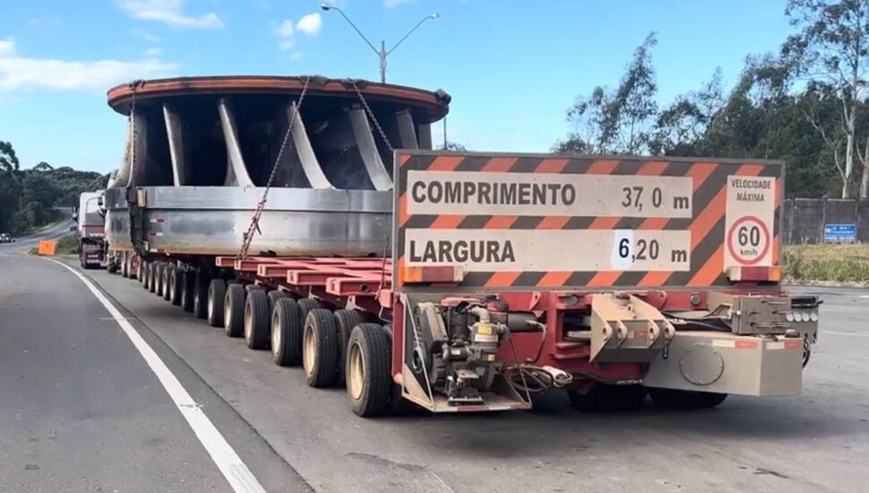 O transporte de uma peça gigante que saiu de Guarapuava, no centro-sul do Paraná com destino a São Paulo, mobiliza equipes da Polícia Rodoviária do Paraná (PRF) nesta quinta-feira (22). Trata-se da parte de uma turbina que saiu da usina da Copel para manutenção em Araraquara, interior de São Paulo. Para chegar lá, a peça gigante terá que cortar o Paraná por várias rodovias.