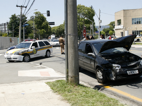 Uma viatura do 12.º Batalhão da Polícia Militar bateu no Corsa placa ANK-9251, no final da manhã de ontem, no Prado Velho. Os policiais saíam da companhia, pela Rua Imaculada Conceição, e entraram na Rua Guabirotuba, no momento em que o Corsa passava pelo cruzamento.
