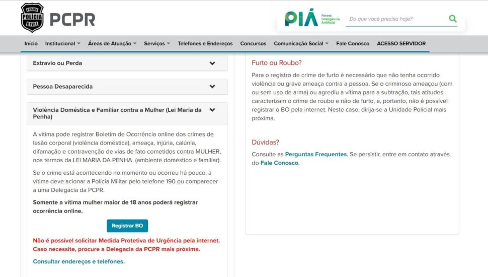 Site da Polícia Civil agora tem a opção de registrar denúncias de violência doméstica. Foto: Reprodução