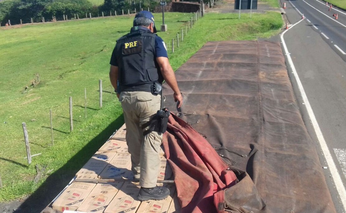 Agentes da Polícia Rodoviária Federal (PRF), apreenderam uma carga de cigarros avaliada em cerca de R$ 1 milhão. Durante a abordagem, os agentes encontraram a carreta lotada de cigarros contrabandeados. Além disso, o caminhão portava placas de outro veículo. O motorista e a carga foram encaminhados para a Polícia Federal.