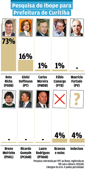 Quase nada mudou na quarta pesquisa Ibope de intenções de voto para a prefeitura de Curitiba e o prefeito Beto Richa (PSDB) segue com ampla vantagem. Desta vez o tucano aparece com 73%, contra 16% de Gleisi Hoffmann (PT), segunda colocada.