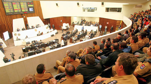 O secretário compareceu à Assembléia, acompanhado do Comandante da Polícia Militar, coronel Luiz Rodrigo Larson Carsten, o Delegado Geral da Polícia Civil, Jorge Azôr Pinto, e o Comandante do Corpo de Bombeiros, coronel Jorge Luiz Thais Martins, além de grupos de policiais civis e militares que ocuparam as galerias.