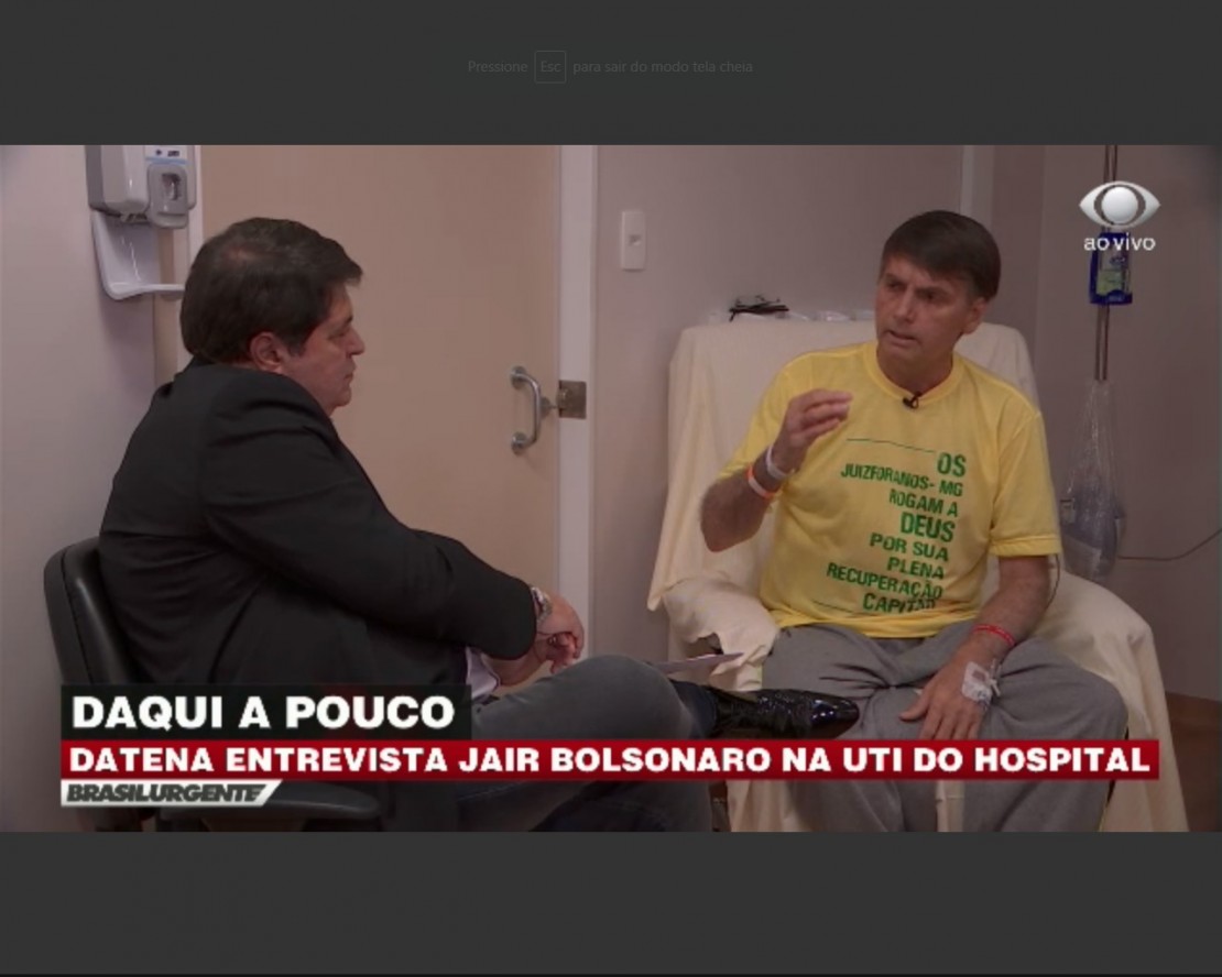 Ainda internado após ter levado uma facada no abdômen, em um atentato ocorrido em Juiz de Fora (MG) no dia 6 de setembro, o candidato à presidência Jair Bolsonaro (PSL), concede uma entrevista na tarde desta sexta-feira (28) ao jornalista José Luis Datena, no Programa Brasil Urgente, na Band.