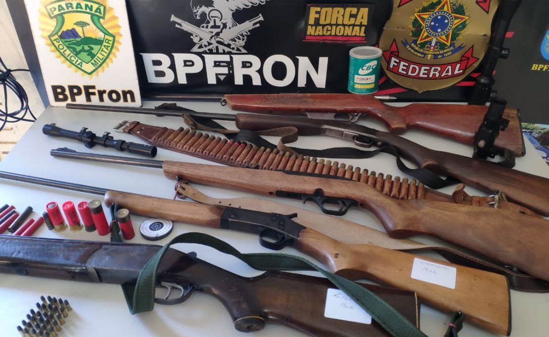 Uma ação conjunta da Polícia Federal, Força Nacional e BPFron/PMPR cumpriu 4 mandados de busca e apreensão, na manhã desta terça-feira (26), expedidos pela Vara Criminal de Santo Antônio do Sudoeste, no Paraná, em imóveis suspeitos de serem utilizados para a guarda de armas e munições ilegais naquele município e em Pranchita/PR.