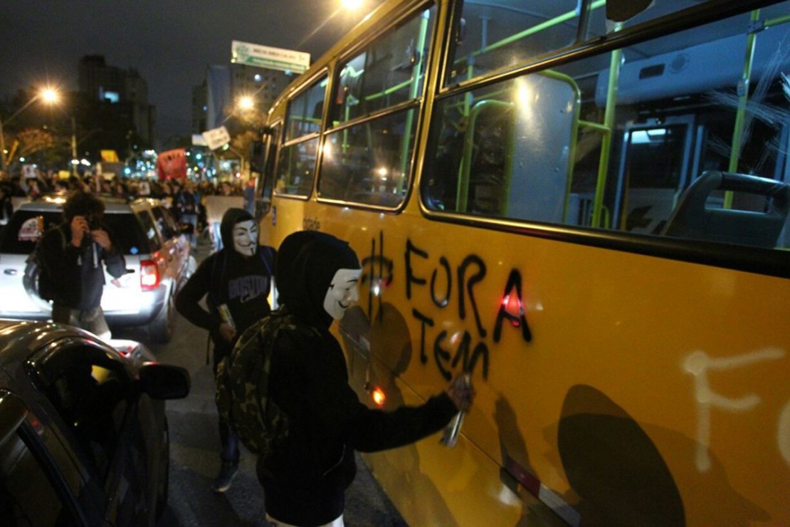 Manifestantes realizam um protesto contra o governo do presidente Michel Temer (PMDB) e o impeachment da presidente Dilma Rousseff (PT) na noite desta quinta-feira (1º) em Curitiba. O ato, que teve concentração na Praça 19 de Dezembro, iniciou com uma passeata que percorre ruas da região central da capital. Durante o trajeto, prédios foram depredados e ônibus, pichados. Segundo a estimativa da Polícia Militar (PM), o grupo é composto por cerca de 400 pessoas.