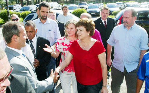 | Dilma em Curitiba, recepcionada pela ex-presidente do PT do Paran&,aacute;, Gleisi Hoffmann e pelo atual, Ênio Verri. |