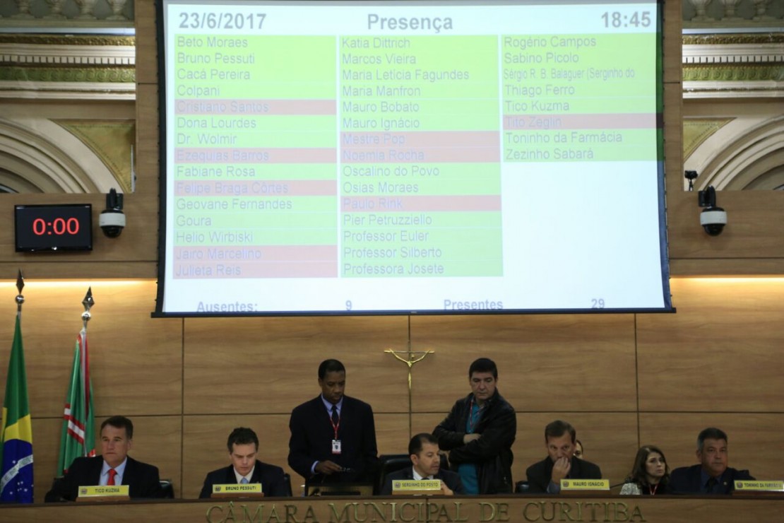 Por 21 votos a 10, os vereadores de Curitiba aprovaram a mudança no local de votação do pacote de ajuste fiscal proposto pelo prefeito Rafael Greca. O presidente da Câmara Municipal, vereador Serginho do Posto (PSDB) convocou uma sessão extraordinária para a noite desta sexta-feira (23) para discutir o assunto, a partir de uma proposta da Secretaria de Segurança Pública do Paraná, que propôs que a sessão ocorra na Ópera de Arame. A convocação chegou ao gabinete dos vereadores ao redor das 17 horas e a sessão foi iniciada às 18h43, com a presença de 29 dos 38 vereadores. O acesso às galerias está limitado a 78 pessoas, como determinado por laudo do Corpo de Bombeiros, mas poucos servidores foram até o local. Há três viaturas policiais.