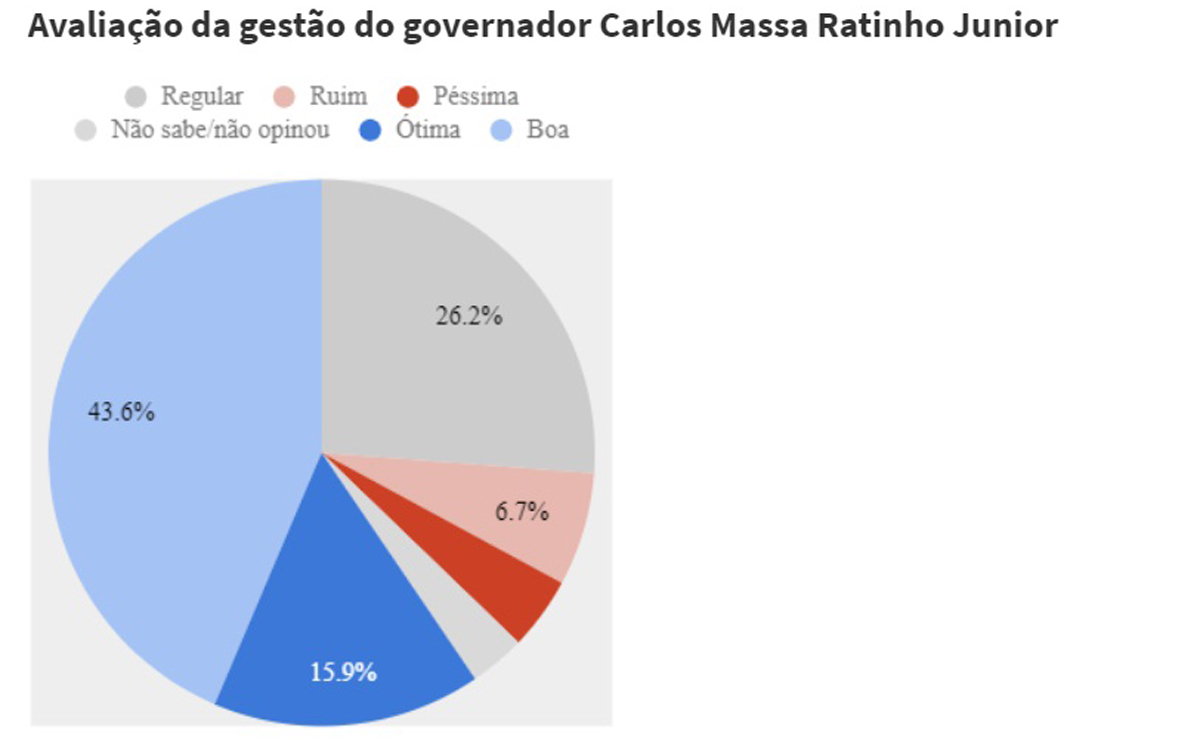 Os entrevistados também foram questionados se a administração estadual está sendo ótima, boa, regular, ruim ou péssima. A maior parte (43,6%) avalia a gestão como boa, enquanto 15,9% consideram ótima. Outros 26,2% classificam como regular. Para 11% o novo governo é ruim (6,7%) ou péssimo (4,3%). Não souberam responder ou não opinaram 3,3% dos entrevistados.