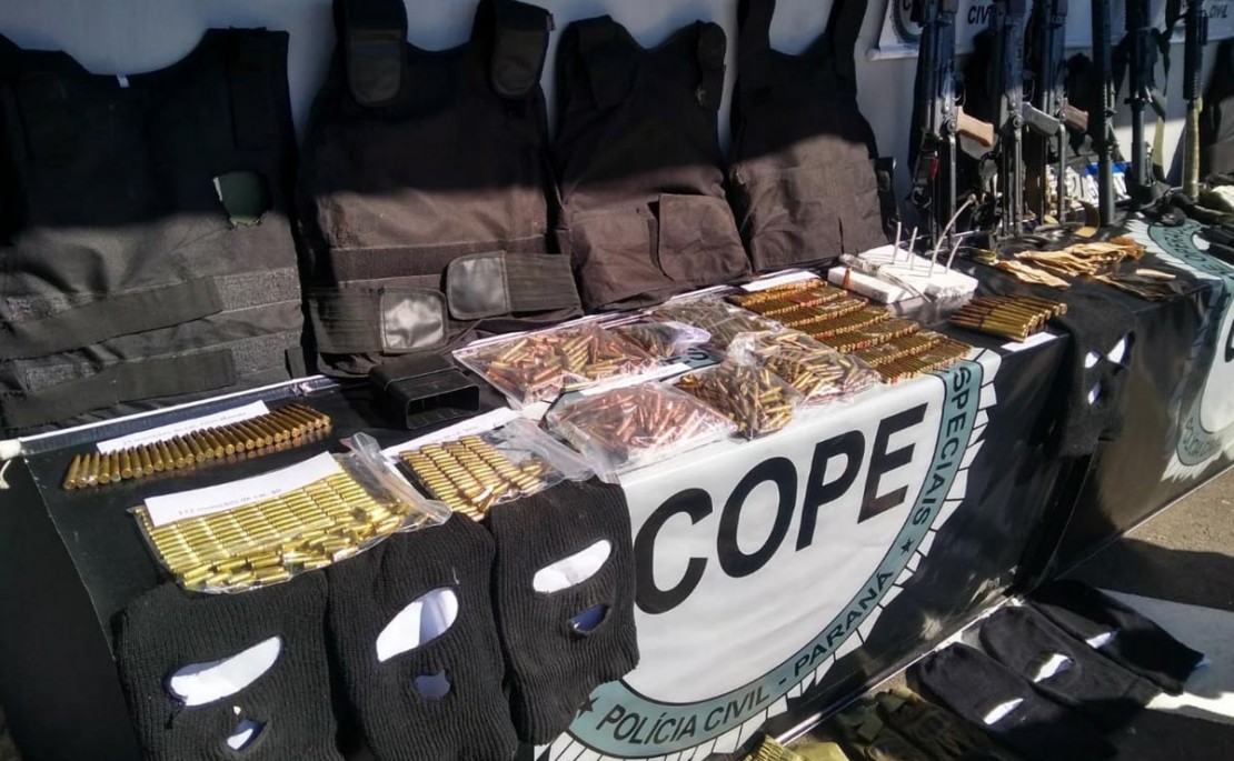 A quadrilha especializada em roubos a bancos presa nesta terça-feira (9), por policiais do Centro de Operações Policiais Especiais (Cope), mantinha um grande arsenal de armas na residência em que foi localizada, no bairro Umabrá, em Curitiba. No local, foram apreendidos 6 fuzis, três pistolas, 24 carregadores de arma de fogo, 10 explosivos, 8 coletes balísticos e até fardas usadas por policiais militares.