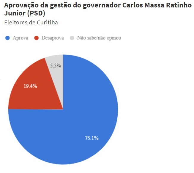 Levantamento feito pelo Instituto Paraná Pesquisas mostra que 75,1% dos curitibanos aprovam a gestão do governador Ratinho Jr (PSD), média superior à do prefeito Rafael Greca (PMN). Os que desaprovam são 19,4%, enquanto 5,5% não souberam ou não opinaram.