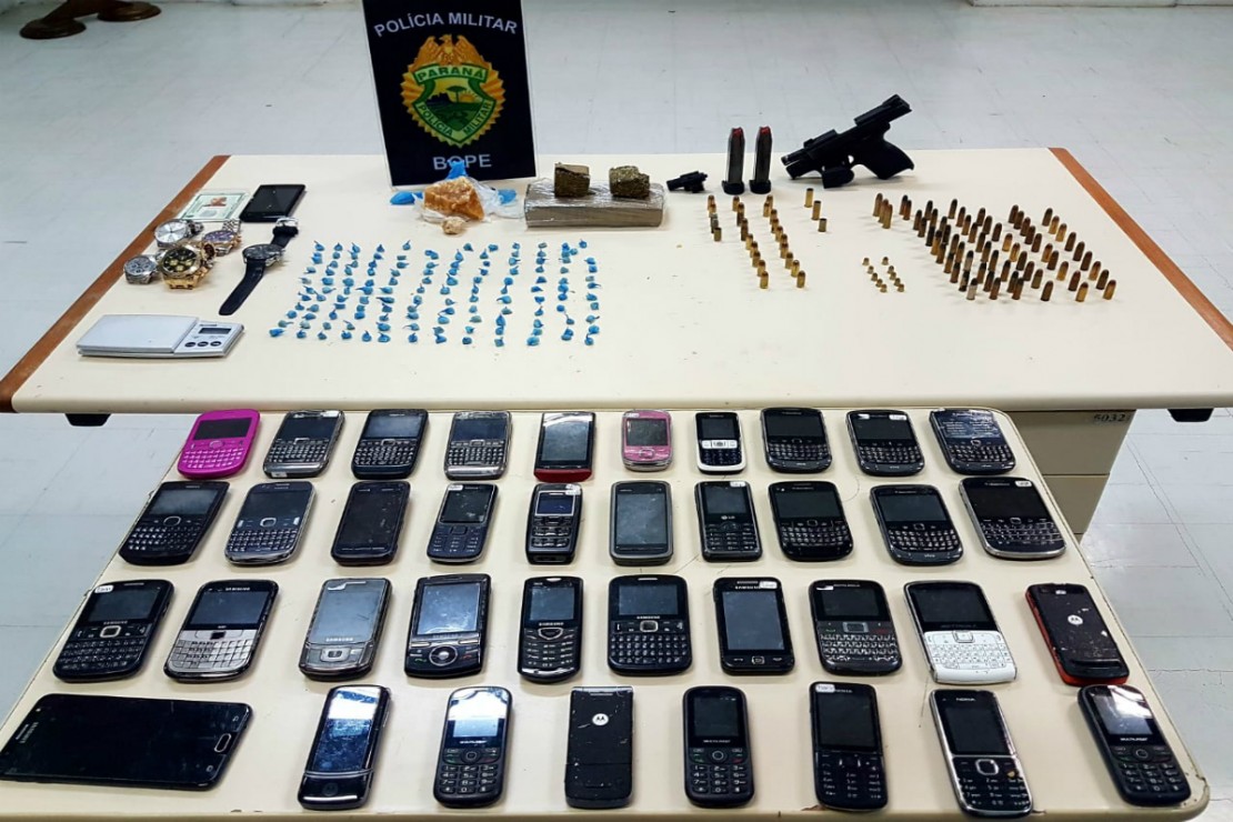 Na mochila, havia um revólver, munições, carregadores, 615 gramas de maconha, 172 gramas de crack, uma balança de precisão, 38 celulares e cinco relógios. O rapaz foi preso em flagrante e encaminhado para a Central de Flagrantes da capital.