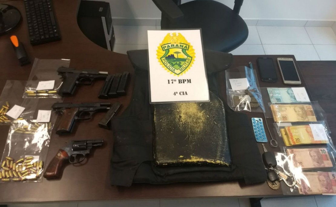 No lugar, a polícia aprendeu o veículo, um revólver calibre 38, uma pistola calibre 765, uma pistola calibre 380, três carregadores de pistola 380 com 16 munições cada, um carregador pistola 765 com 13 munições, R$ 4,5 mil em dinheiro, 37 gramas de maconha e um colete balístico com placa de cerâmica. O trio foi encaminhado à Delegacia de Fazenda Rio Grande.